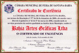 Poucos dias depois, em 30 de novembro de 2006, comemoramos nossos 35 anos de história com mais uma conquista: o certificado de Excelência da Câmara Municipal de Feira de Santana, em reconhecimento aos serviços prestados à cidade.