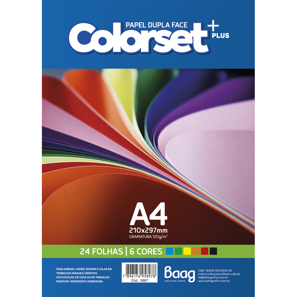 Folhas: coloridas Produto certificado: FSC Formato: 210mm x 297mm Gramatura: 120 g/m² Embalagem: 24 folhas Caixa: 30 Unidades
