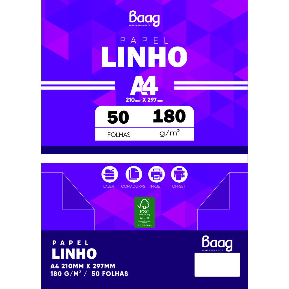 Folhas: lisas Formato: 210mm x 297mm Gramatura: 180 g/m² Pacote: 50 folhas